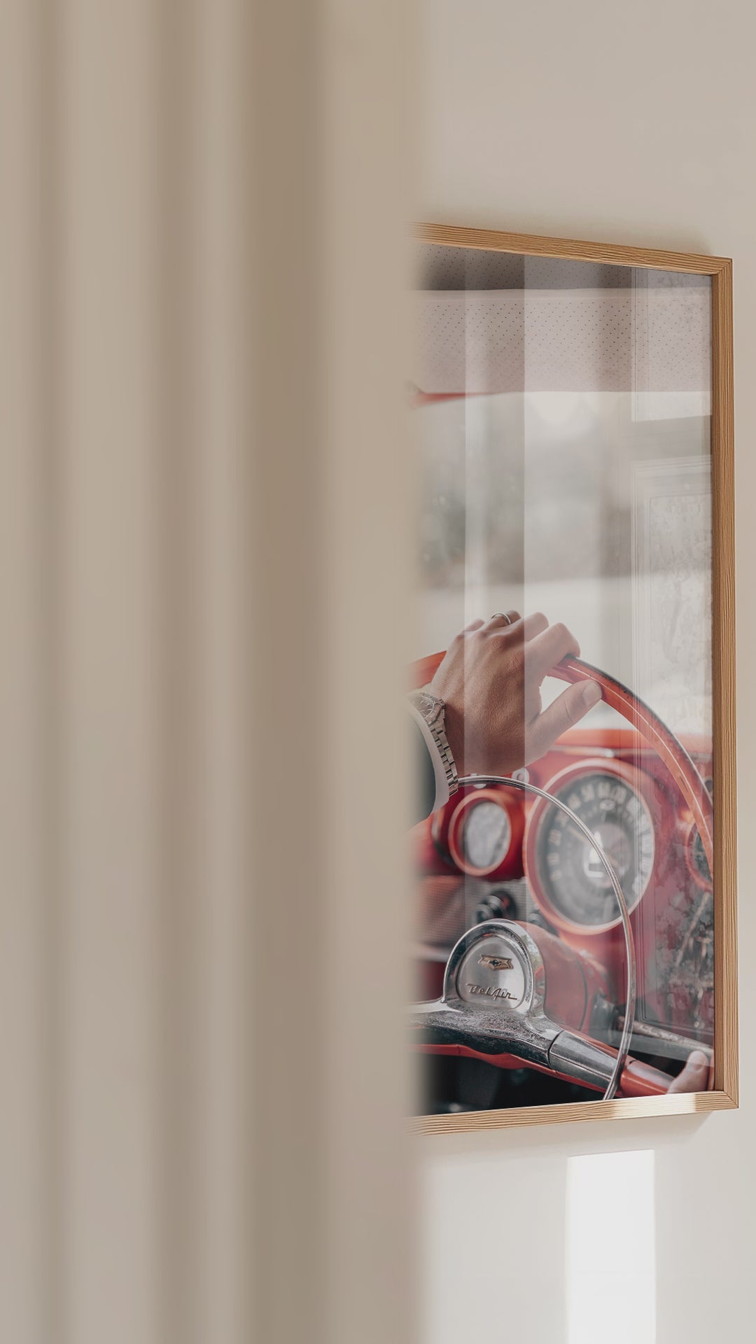 Ett tidlöst motiv som fångar interiören av en klassisk Chevrolet Bel Air – krom, kurvor och nostalgi i perfekt harmoni.