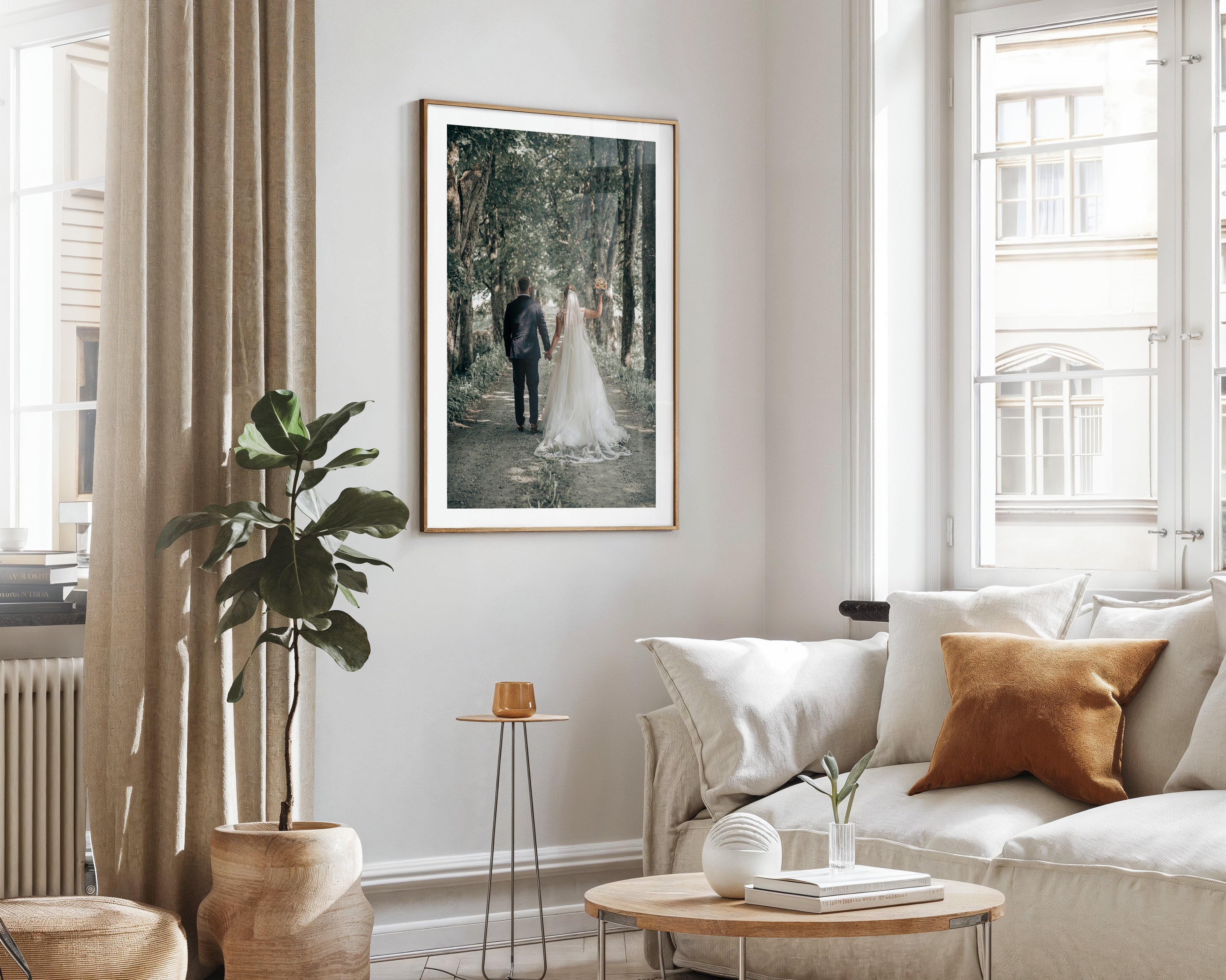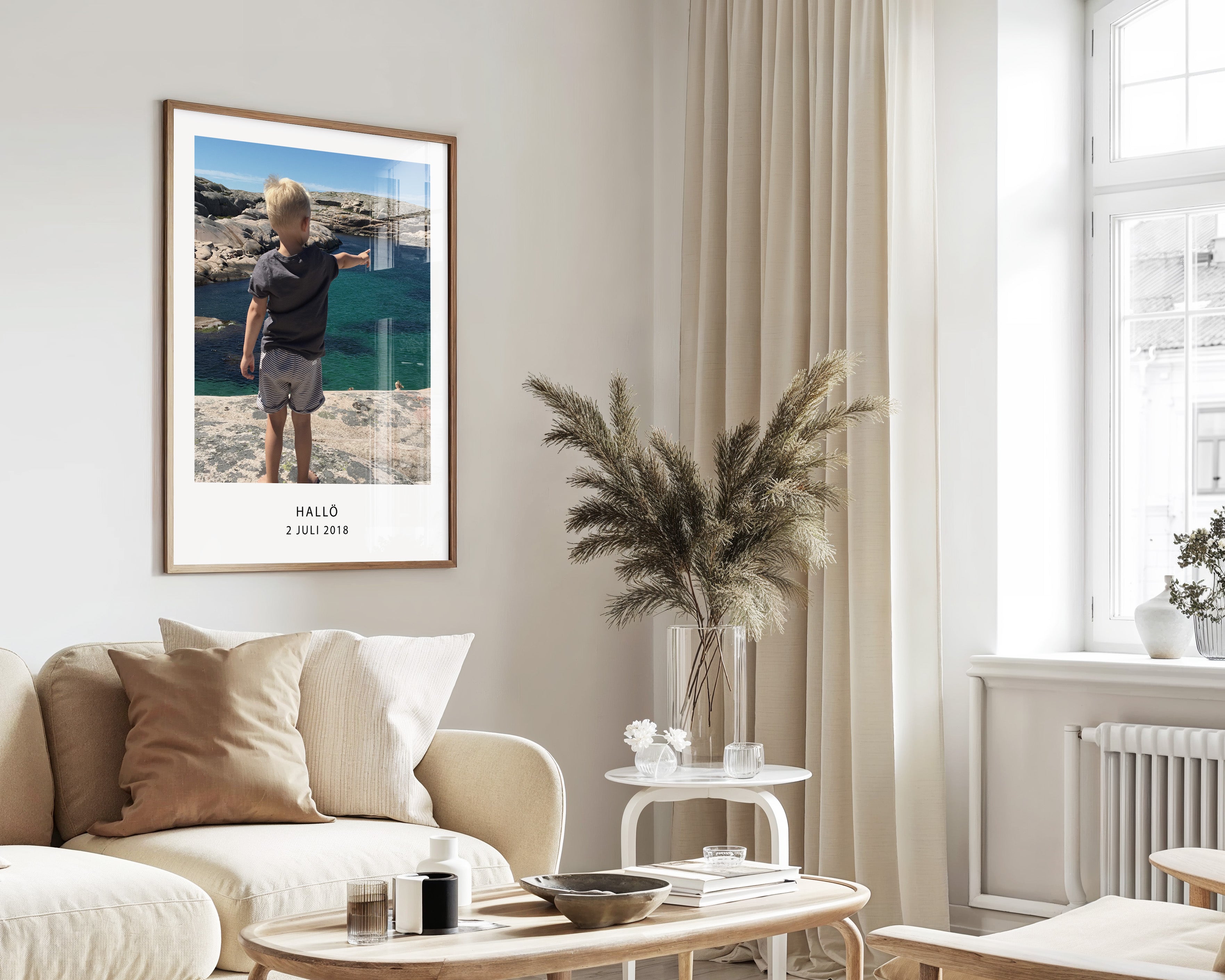 Vi skapar en stilren och harmonisk layout där din bild står i fokus, omgiven av en vacker passepartout-effekt och med din valfria text placerad elegant under motivet. Resultatet blir en modern, unik väggtavla som lyfter vilket rum som helst.